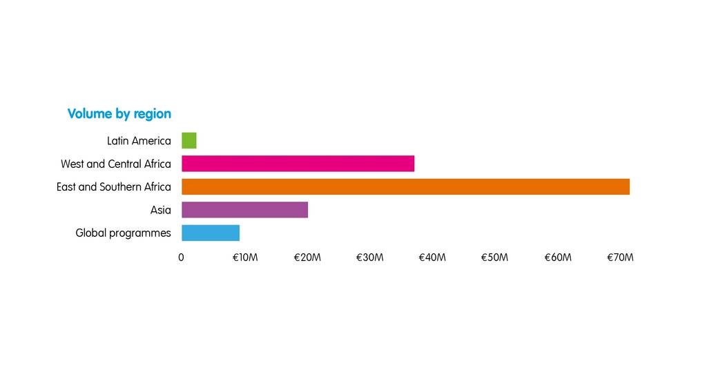 In 2019, we spent €91M on agriculture projects, which amounts to 64% of our total project expenditure. The agriculture order intake continued to grow. The €140M worth of new contracts we signed was well above our target. New projects on inclusive value chains and youth employment dominated. New contracts were concentrated in Sub-Saharan Africa.